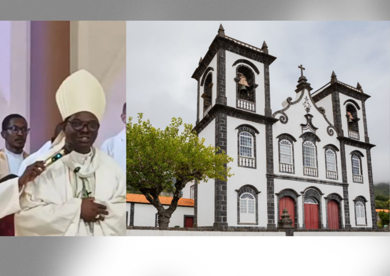 Monseigneur António Manuel Bogaio Constantino et à droite l'église São Mateus Apóstolo