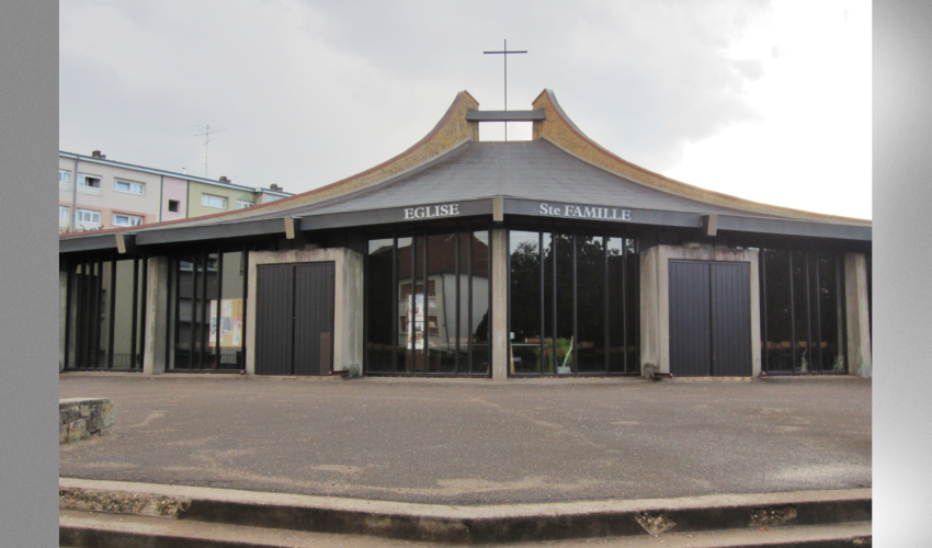 Construite à la fin des années 1960, l’église de la Sainte-Famille a été édifiée en 1968 et consacrée le 26 novembre 1970. Elle est considérée comme le premier édifice religieux de style contemporain construit en Moselle. Implantée rue Villars, elle s’inscrit dans un quartier au tissu urbain contrasté, mêlant grands ensembles d’habitat collectif et maisons individuelles.L’architecte Jean-Louis Jolin a conçu l’édifice en tenant compte de cet environnement. Il a opté pour une architecture contemporaine sobre, caractérisée par des murs rayonnant en étoile et par des toitures aux lignes légèrement courbes. La symbolique y occupe une place importante, la forme générale évoquant le poisson des premiers chrétiens, les murs en étoile traduisant le caractère rayonnant de l’Église, et les sept poutres convergeant au-dessus de l’autel rappelant les sept sacrements.