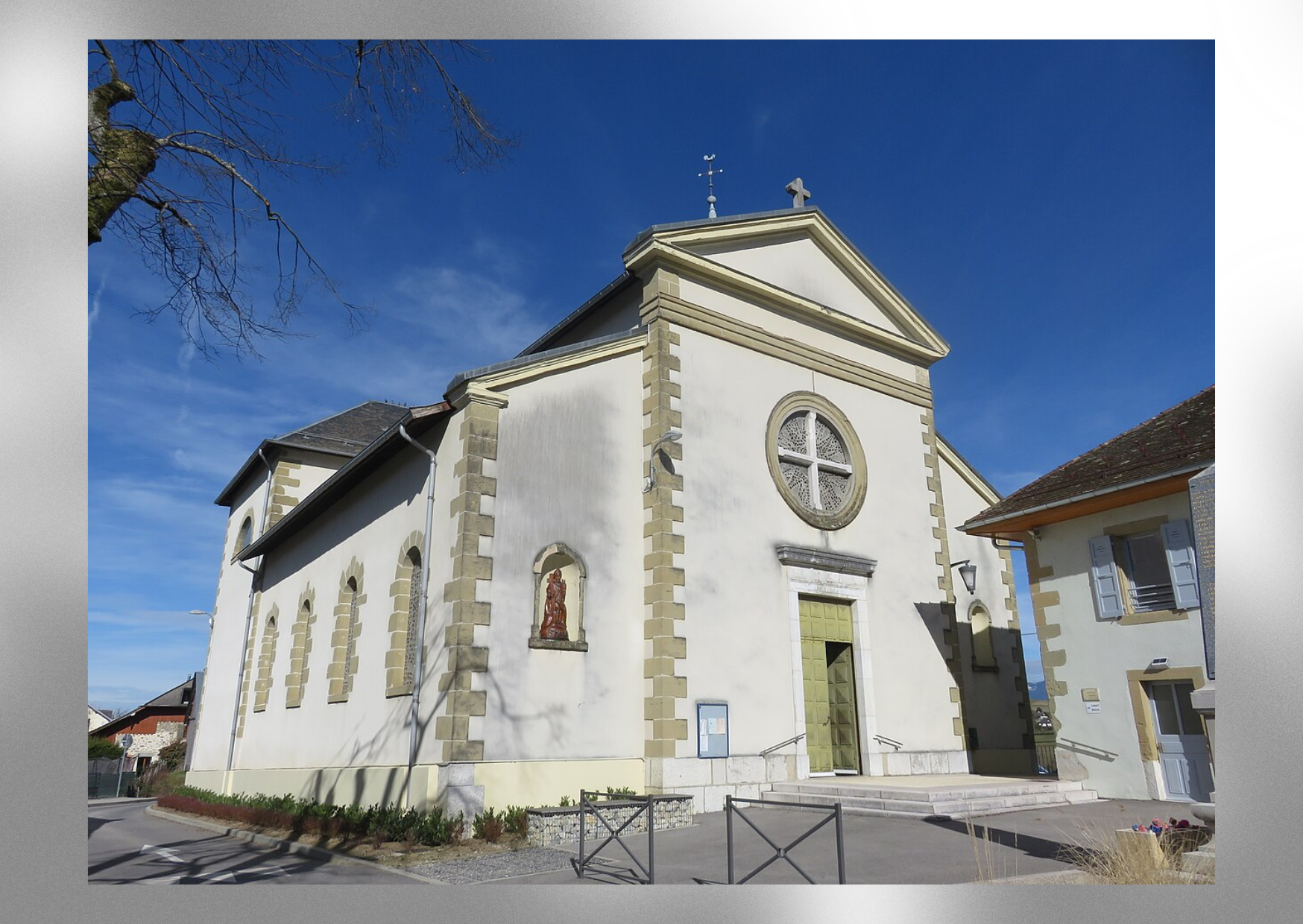 L’église actuelle, de style néoclassique, fut bâtie entre 1842 et 1844 perpendiculairement à la précédente, dont elle conserva le clocher. Elle fut consacrée le 19 octobre 1845 par Mgr Louis Rendu, évêque d’Annecy, en présence du syndic Aimé Tissot et du curé Aimé Albert Périllat. Le cimetière, autrefois situé autour de l’église, fut déplacé en 1954. En 1921, le monument aux morts de la commune fut inauguré sur la place de l’église, restaurée et piétonnisée en 2014.Aujourd’hui, l’église Saint-Maurice, haute de 28 mètres, demeure l’une des plus grandes églises rurales de l’Albanais. Elle dépend du diocèse d’Annecy et appartient à la paroisse Notre-Dame-de-l’Aumône-en-Albanais.