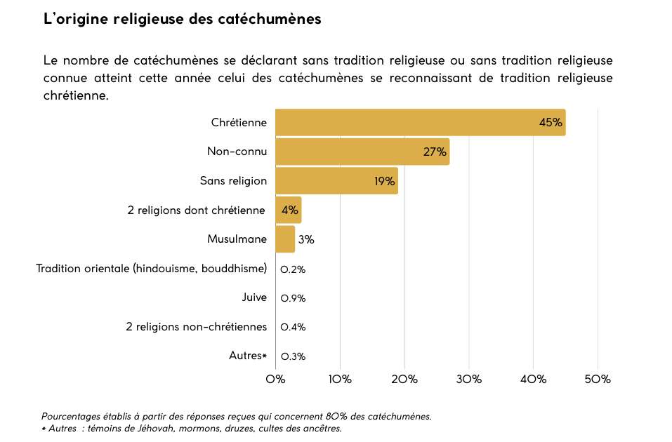 Ce mouvement se vérifie concrètement dans les diocèses, y compris dans les grandes villes. À Paris, 788 catéchumènes adultes seront baptisés en 2026. Ce chiffre confirme une progression continue depuis plusieurs années, puisqu’ils étaient 363 en 2020, 347 en 2021, 351 en 2022, avant une reprise nette en 2023 avec 418, puis 520 en 2024 et 671 en 2025. En quelques années, le nombre a ainsi plus que doublé.Ces catéchumènes sont issus de 94 paroisses sur les 106 que compte la capitale, ainsi que de plusieurs communautés étrangères, signe que le phénomène est désormais largement diffusé dans tout le diocèse et ne se limite plus à quelques foyers isolés. Leur profil rejoint les tendances nationales, avec une forte proportion de jeunes adultes, 80 % ayant moins de quarante ans, et une majorité de femmes, à hauteur de 58 %. Là encore, il s’agit le plus souvent de démarches personnelles, engagées en dehors d’un cadre familial chrétien structuré.