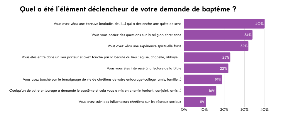 Les motivations exprimées témoignent d’itinéraires personnels profonds. Quarante pour cent évoquent une épreuve de vie, trente-quatre pour cent un questionnement intérieur, et trente-deux pour cent une expérience spirituelle marquante. Les réseaux sociaux restent marginaux dans ces parcours, cités par seulement 11 % des répondants.
