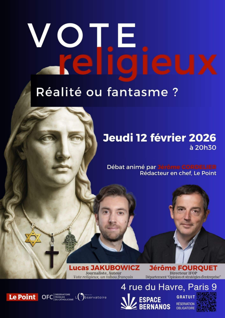 Le 12 février 2026, une rencontre publique propose d’examiner sereinement la réalité du vote religieux en France, souvent évoqué mais rarement analysé en profondeur. Animé par Jérôme Cordelier, rédacteur en chef au Le Point, l’échange réunira Jérôme Fourquet, directeur du département Opinion à l’IFOP, et Lucas Jakubowicz, rédacteur en chef de Décideurs Magazine.