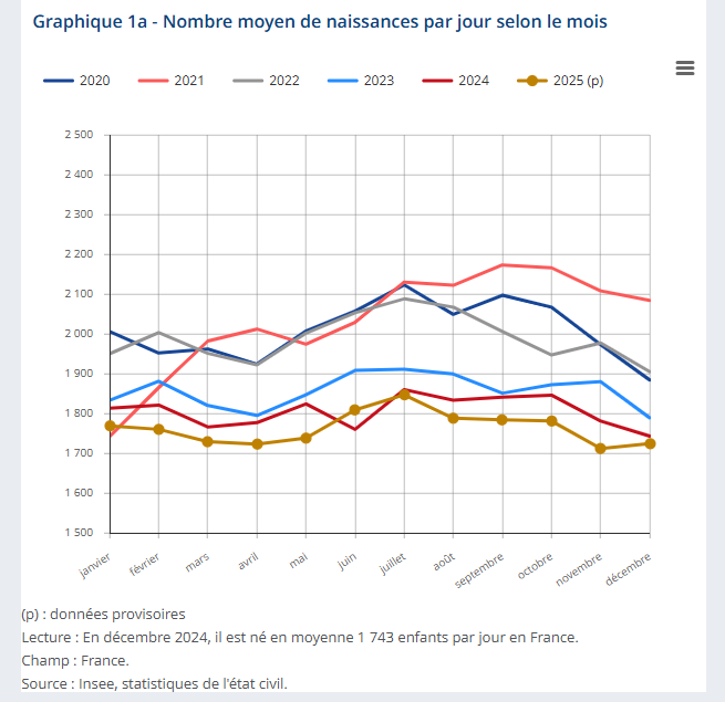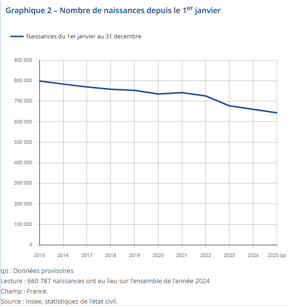 Évoquant les mots « père », « mère », « fils », « fille », « grand-père » et « grand-mère », il avait souligné qu’ils expriment des réalités de respect, de dévouement et de transmission, parfois héroïques, au service du bien commun.Enfin le pape Léon XIV avait insisté sur l’attention indispensable à porter aux réalités concrètes de la maternité et de la paternité.Précisons que de nouvelles données relatives aux naissances de janvier 2026 seront publiées le jeudi 26 février 2026 , elles permettront de mesurer si le début de la nouvelle année confirme cette trajectoire. À ce stade, le constat est clair. La France ne se renouvelle plus. Et ce déclin démographique, désormais confirmé par des révisions successives, constitue une crise majeure aux conséquences humaines, sociales et civilisationnelles durables.