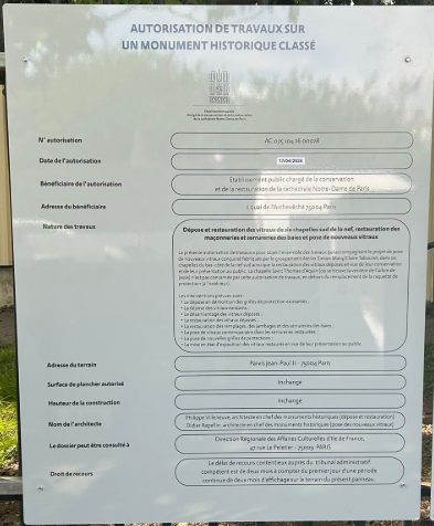 Un nouveau cap vient d’être franchi dans le vaste chantier de restauration de la cathédrale Notre-Dame de Paris. Comme en témoigne le panneau désormais visible aux abords du site, l’autorisation officielle de travaux pour la dépose et le remplacement des vitraux a été délivrée et affichée. Une étape administrative en apparence technique, mais qui ouvre en réalité une séquence cruciale, à la fois patrimoniale, artistique et spirituelle. Le document, daté du 17 avril 2026, concerne un monument historique classé et précise la nature des interventions à venir. Il s’agit notamment de la dépose et de la restauration des vitraux de six chapelles situées au sud de la nef, accompagnées de travaux sur les maçonneries et les serrureries, ainsi que de la pose de nouveaux vitraux contemporains. L’ensemble est piloté par l’établissement public chargé de la conservation et de la restauration de la cathédrale, avec des architectes en chef des monuments historiques.