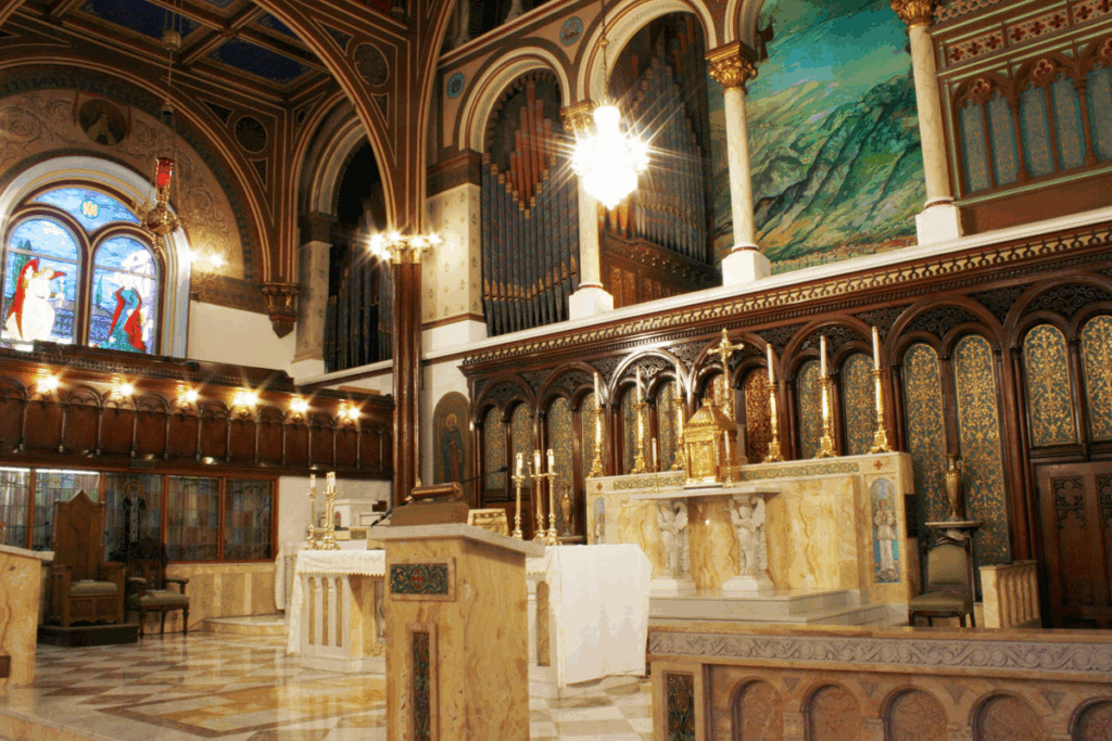 L’intérieur de la cathédrale rassemble également des éléments provenant d’origines diverses. Dans les années 1950, l’artiste libanais Saliba Douaihy réalisa les vitraux, apportant une dimension artistique maronite distincte à un bâtiment d’origine protestante. Certains sols en marbre et en onyx proviennent de pavillons de l’Exposition universelle de New York de 1939, réutilisés lors de l’aménagement de la cathédrale. L’orgue, construit en 1870, fut conservé et restauré, demeurant un témoin de la période antérieure à la transformation du lieu. Cette superposition d’éléments, une façade et une structure protestantes du XIXᵉ siècle, des portes d’un paquebot transatlantique des années 1930, des vitraux d’un artiste libanais du milieu du XXᵉ siècle, confère à la cathédrale une identité particulière. Elle témoigne du caractère composite de l’histoire religieuse, culturelle et migratoire de New York.