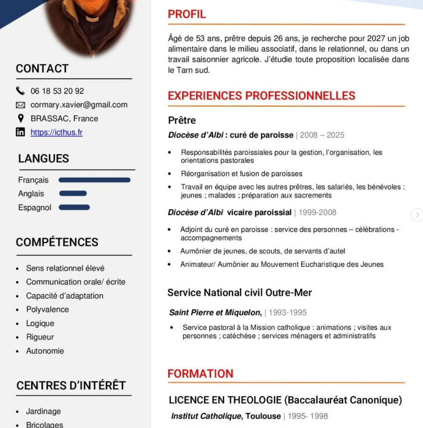 Sur son profil, l’abbé Xavier Cormary, curé dans le diocèse d’Albi depuis 2008, évoque la possibilité de travailler dans le milieu associatif, relationnel ou agricole. Un signal d’alarme, non seulement sur la précarité du clergé diocésain, mais aussi sur la gestion d’un diocèse qui, malgré ses effectifs, semble à court de souffle financier.