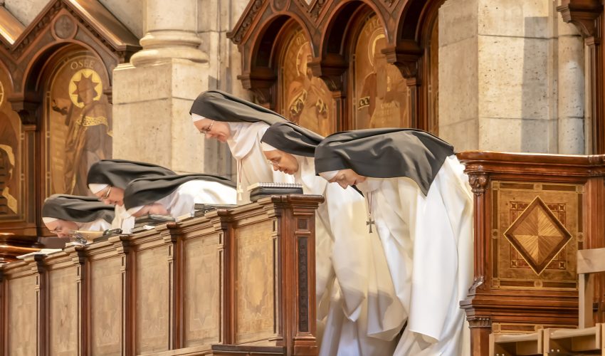 Paris, France - March 14, 2018: Nuns praying inside The Basilica of the Sacred Heart of Paris, is a Roman Catholic church and minor basilica, dedicated to the Sacred Heart of Jesus