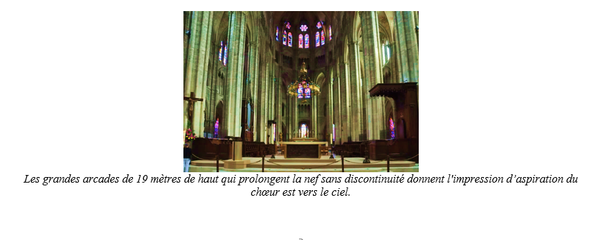 Les grandes arcades de 19 mètres de haut qui prolongent la nef sans discontinuité donnent l’impression d’aspiration du chœur est vers le ciel.