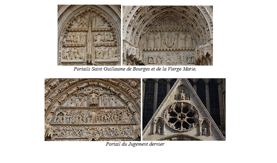 La façade occidentale de 41 mètres de large à l’intérieur, 55 à l’extérieur, et même plus de 73m en comptant le pilier Sud ; est la plus imposante parmi celles des édifices gothiques de France. Elle se compose de deux tours carrées (représentant la relation entre l’homme, Dieu et l’infini) de hauteurs inégales, la tour Nord ayant été reconstruite après son effondrement en 1506. Le parvis permettant d’accéder à cette façade conduit à un grand escalier. Cinq portails dédiés à Guillaume de Bourges, à la Vierge Marie, au Jugement dernier (portail central, d’une grande qualité d’exécution.), au martyr Étienne et à Ursin de Bourges, permettent l’accès à l’intérieur ; tous sont à double porte, tous sont surmontés d’un haut tympan triangulaire (celui du centre est en plus ouvert d’une rosace à 8 pétales, rappelant la rosace au sommet du triangle de la voute occidentale, à 6 pétales, à l’instar de celles des portails Nord et Sud, et rappelant aussi les rosaces au sommet des grandes verrières du chœur, à 8 pétales) ; ces portails correspondent exactement aux cinq nefs. Notons aussi que le Grand Housteau, immense verrière occidentale constituée de lancettes (6), 4 petites roses et une grande rose de 2X12 pétales, est l’élément central de la façade. Leurs sculptures sont particulièrement remarquables. La cathédrale est une représentation de la Jérusalem céleste. Bourges ne possède pas une école cathédrale ayant des maîtres aussi célèbres que celles de Chartres, de Laon ou de Paris qui ont dû influencer les plans de ces cathédrales en traduisant dans la pierre et la décoration la description de la Jérusalem céleste, faite dans l’Apocalypse de Jean. En regardant en détail le Jugement dernier, on peut reconnaître l’un des personnages caractéristiques : il s’agit d’un moine franciscain ceint de la corde à triple nœuds et portant les stigmates du Christ, envoyé au Paradis par l’Archange Saint Michel…. Il s’agit de saint François d’Assise, de passage à Bourges à cette époque. En levant la tête, on peut aussi observer que l’archange Saint Michel pèse les âmes des morts ; les uns vont en enfer, dans le grand chaudron, et à l’opposé, les autres vont dans le sein d’Abraham. Un crapaud (animal réputé diabolique) cherche à fausser la pesée des âmes en ajoutant son poids dans la balance pour la faire pencher vers l’enfer.