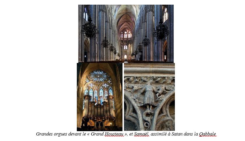 Les écoinçons, sur la façade sont ces petits triangles sculptés situés à hauteur d’homme ou presque, comprenant des personnages et des scènes parfois curieuses. Pendant des siècles, les spécialistes se sont penchés sur ces sculptures, qui représentent de manière classique, des scènes de la Bible. Mais sur toute une partie de ce programme, certaines scènes demeuraient incompréhensibles pour tout chercheur voulant donner une signification conforme à l’enseignement conventionnel. Le mystère de ces sculptures était total jusqu’aux recherches de Laurence Brugger en 2000[ii], qui ont montré l’utilisation de textes hébraïques que l’on retrouve dans la Qabbale ou Cabbale (Kabbale dans sa forme anglo-saxonne), et qui font de ce programme, attribué à saint Guillaume[iii], un élément unique dans une grande cathédrale gothique. On voit ainsi Samaël, personnage des légendes juives, ange déchu assimilable à Satan, trônant sur un serpent, entouré de dragons.