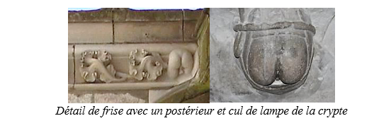 L’église basse est reliée à la crypte romane cruciforme. Dans la crypte, qui est semble –t-il la plus vaste de France, dans le couloir de la descente, des rails du XIXe siècle apparaissent ; ils servaient aux wagons qui transportaient le charbon pour le calorifère, qui servait à chauffer par le sol une partie de l’édifice. En poursuivant vers cette » église basse » qui recèle le jubé d’autrefois, en pièces détachées, nous voyons une partie du tombeau du duc Jean de Berry et les restes de certains vitraux de la Sainte Chapelle. Cette crypte est donc un lieu de conservation d’objets assez hétéroclites, notamment de grandes sculptures autrefois sur la façade de la cathédrale. Mais on peut remarquer aussi les multiples plans tracés au sol : compte tenu de la grandeur de la surface plane, les maîtres de Bourges ont réalisé des tracés au sol directement dans la pierre afin de construire les fenêtres ajourées ou ce qui est le Grand Housteau de 150m² avec la rose de la façade occidentale gravée dans le sol. Pendant la construction de la cathédrale, l’église basse a ainsi dû servir de loge pour les ouvriers employés par la fabrique. Sous la crypte, en s’enfonçant encore, on pénètre dans une église romane, sous laquelle sont enterrés les archevêques de Bourges. Encore au-dessous quelques galeries souterraines sont assez impressionnantes. Le retour à la lumière passe par l’intermédiaire d’un beau couloir, orné de culs de lampe, dont un représente un personnage montrant son postérieur. Mécontent de ses conditions de travail (ou amateur de nus ? ou sacrilèges ? ou simples artisans facétieux ?), un tailleur de pierre (ou plusieurs ?) aurait sans doute dissimulé aux maîtres d’ouvrage des sculptures représentant des paires de fesses dans les hauteurs de l’édifice, loin des regards des fidèles, dans la galerie Nord qui descend à la crypte, ou encore à l’extérieur, côté Sud, bien cachées sur le côté d’une chapelle rayonnante.