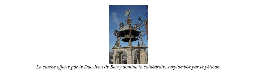 La cloche du duc Jean de Berry, date de 1372. N’ayant plus de battant, elle ne sonne plus mais possédait le timbre d’une horloge. Elle surmonte la tour, surplombée d’un pélican.