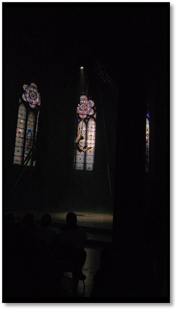 Nous avons voulu voir de nos propres yeux. Alors nous avons assisté à ce spectacle, pour tenter d’en comprendre la logique revendiquée de « tout déconstruire ». Le soir du spectacle, la chapelle affiche complet. Le cadre n’a guère changé : vitraux en excellent état et en particulier celui de Sainte Jeanne d’Arc, qui sert de décor à la scène, les croix sur les colonnes, autels latéraux ,tous les signes sacrés sont encore en place. Seul l’autel a disparu, remplacé par un portique de cirque. C’est dans ce cadre que se déroula une soirée mêlant acrobaties de cirque, danses lascives, nudité, remarques et humour obscènes. Absolument tout était sexualisé.